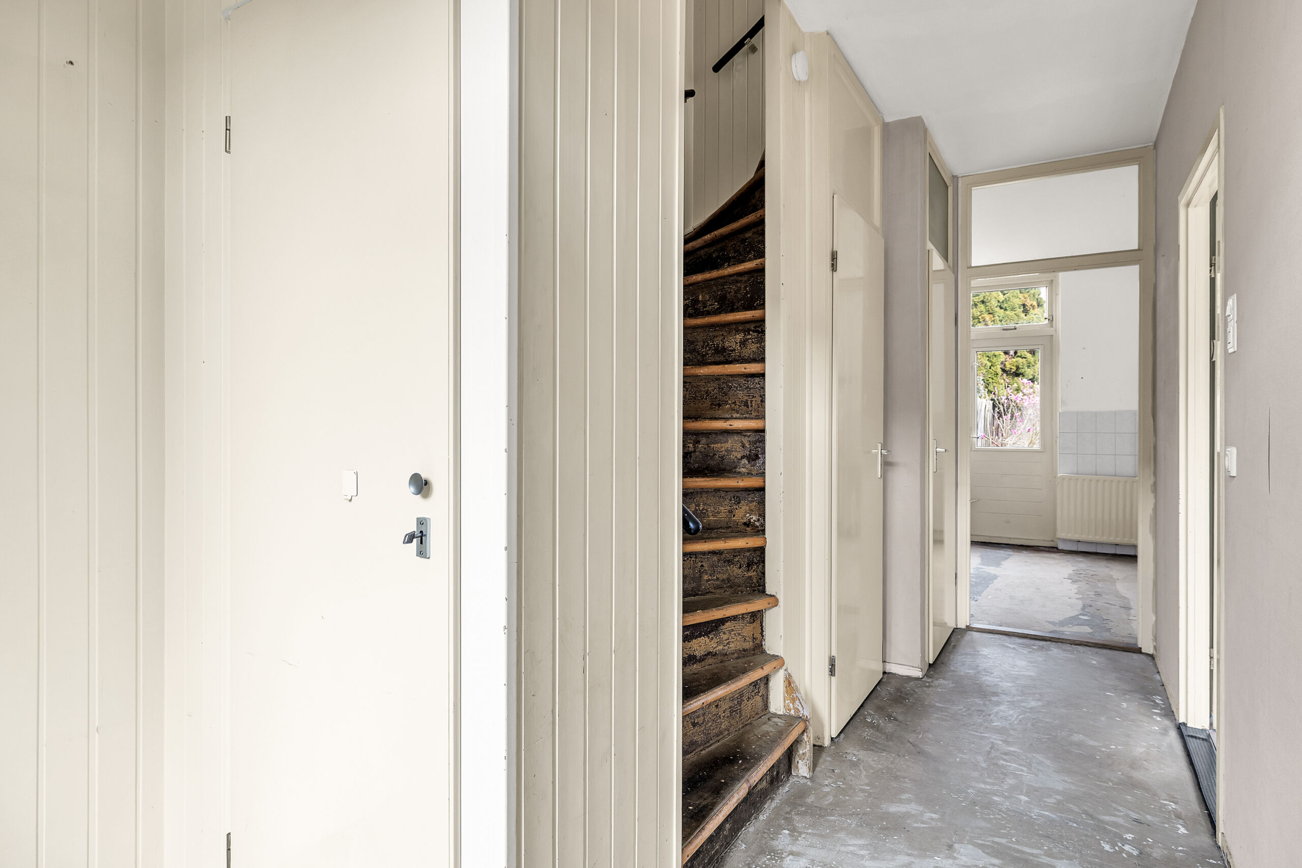 royale gang met garderoberuimte, trapopgang, trapkast, toilet met fonteintje, keuken met toegang tot de diepe achtertuin, woonkamer