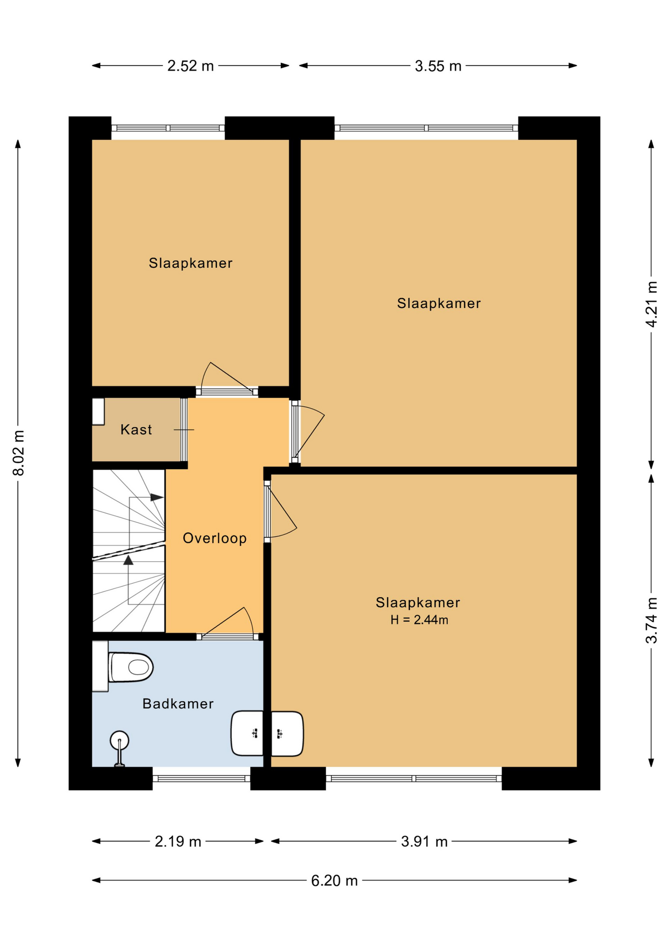 overloop met bergkast, 3 prima slaapkamers, badkamer met douchecabine, 2e toilet, wastafel en designradiator