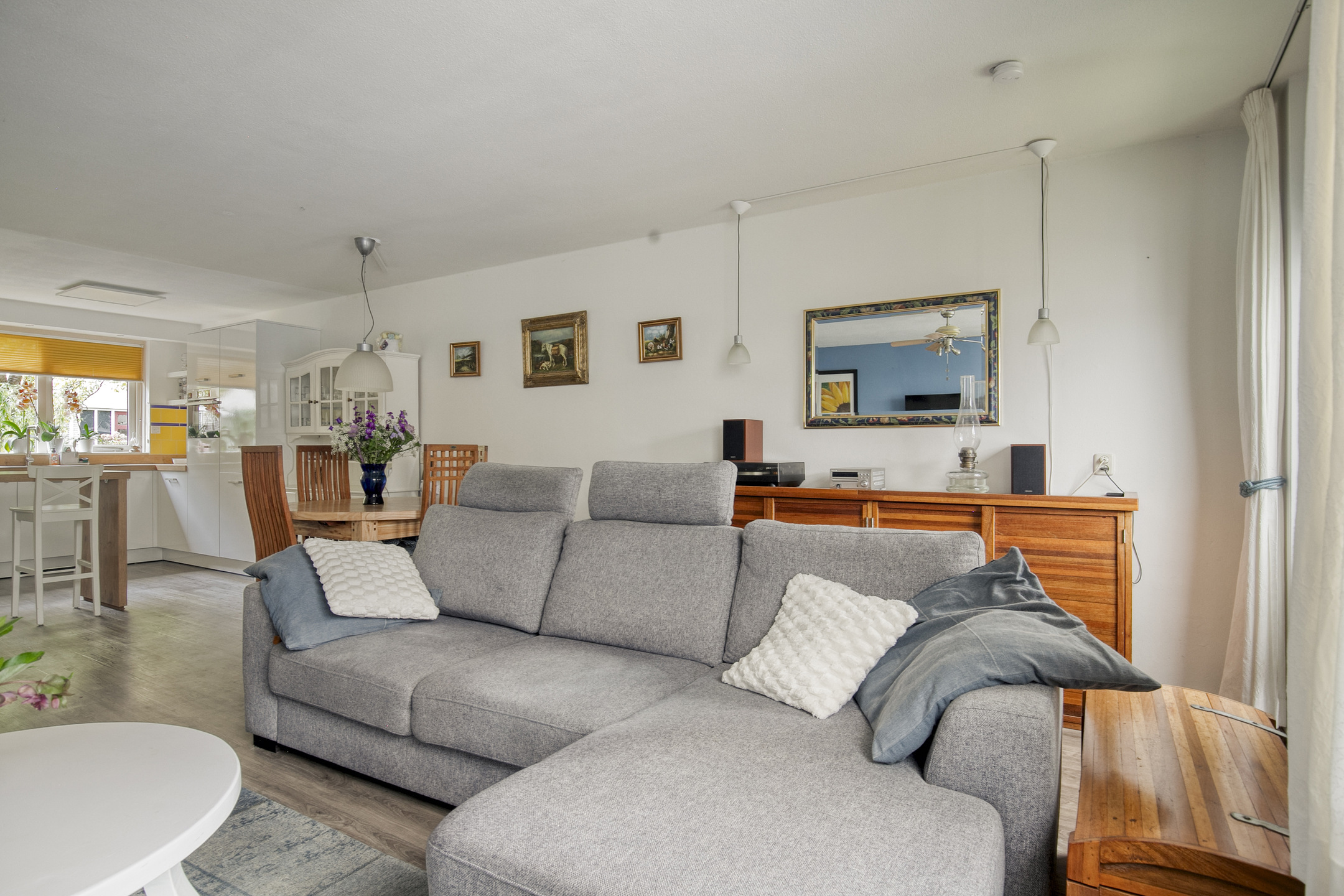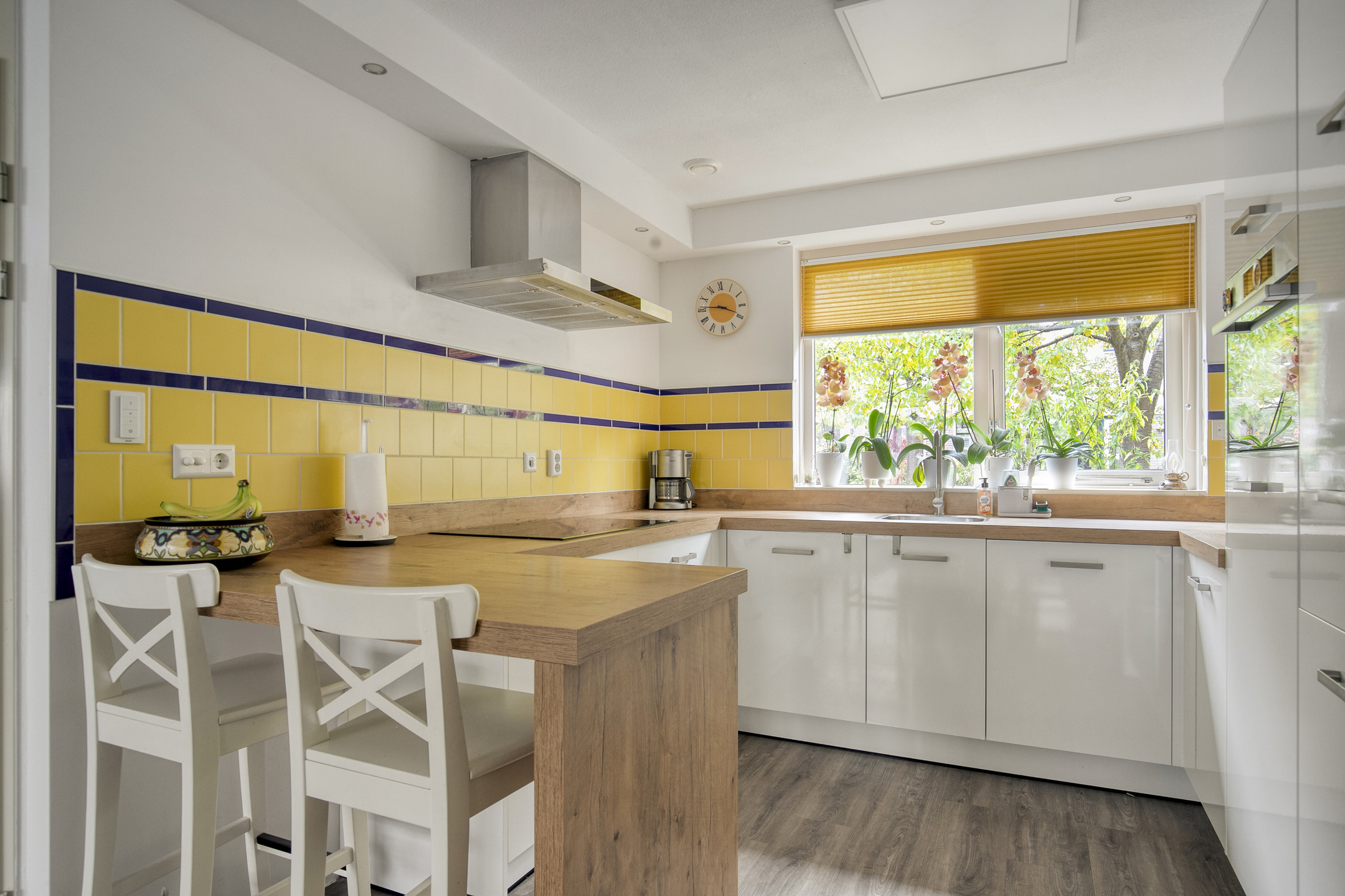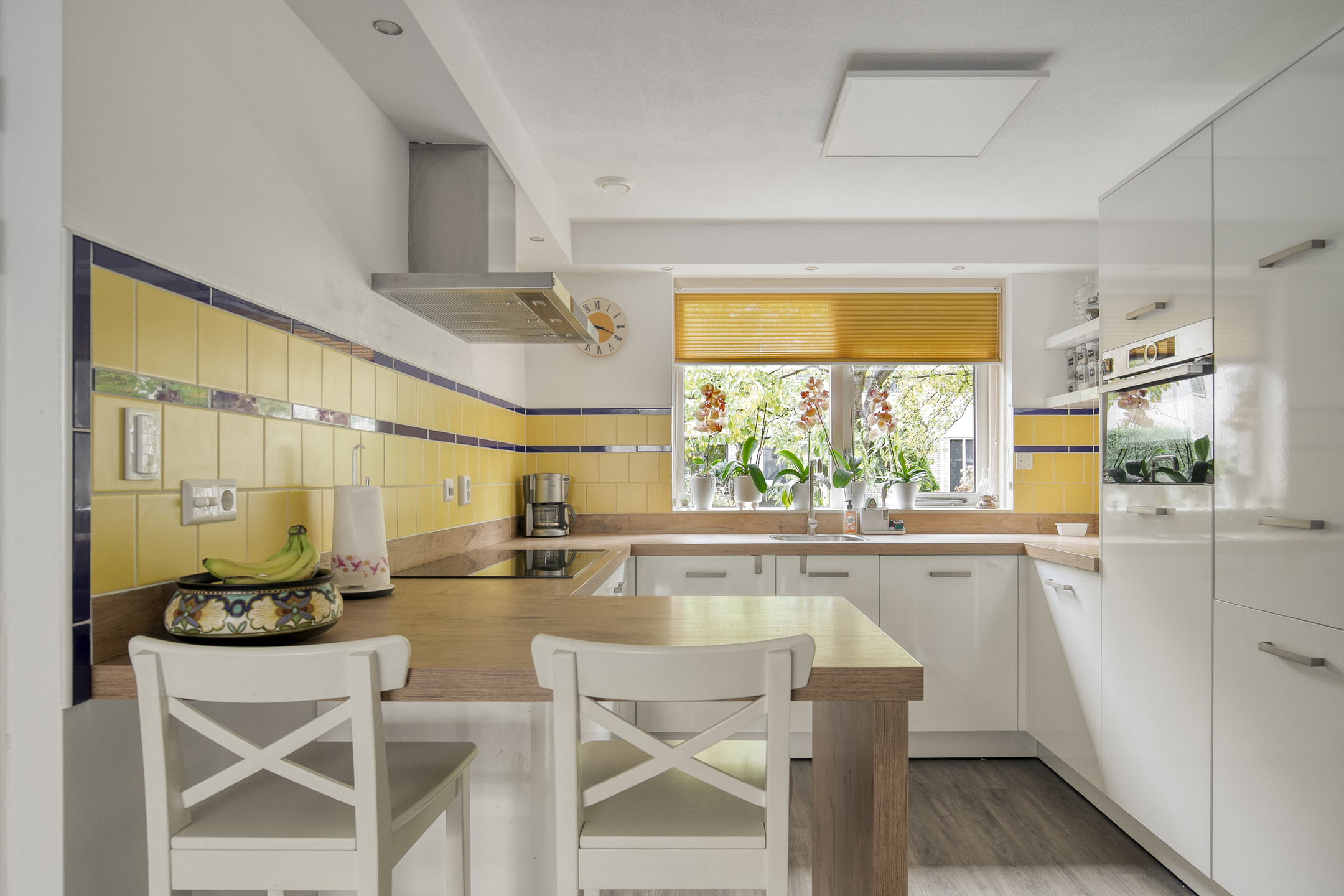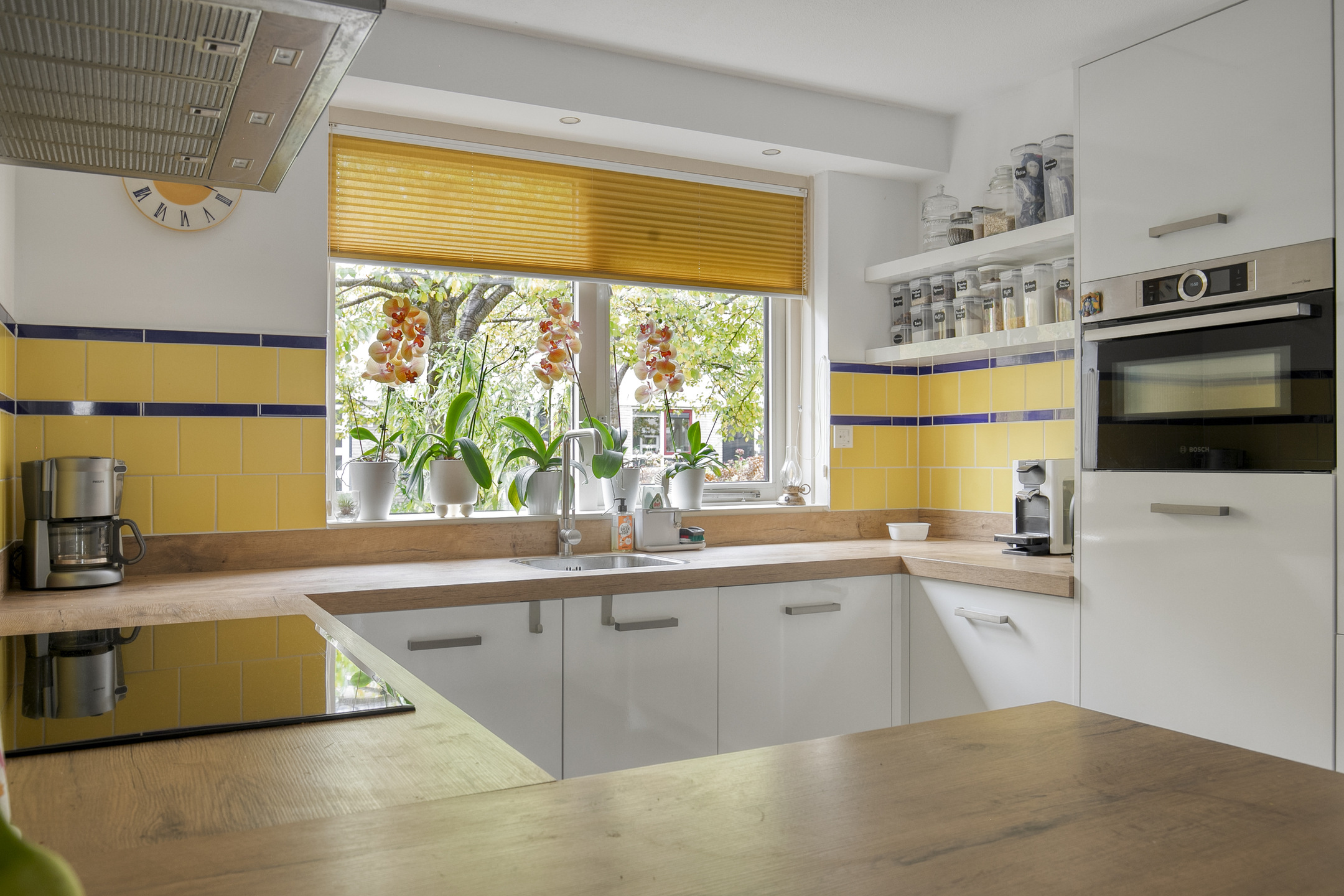Stap binnen in de fris afgewerkte woonkamer met luxe open keuken (2020) en gezellige eetbar. Een plek om aan te schuiven voor ontbijt, huiswerk of een borrel. De keuken is royaal opgezet, strak uitgevoerd en voorzien van Bosch en Siemens inbouwapparatuur, namelijk een: