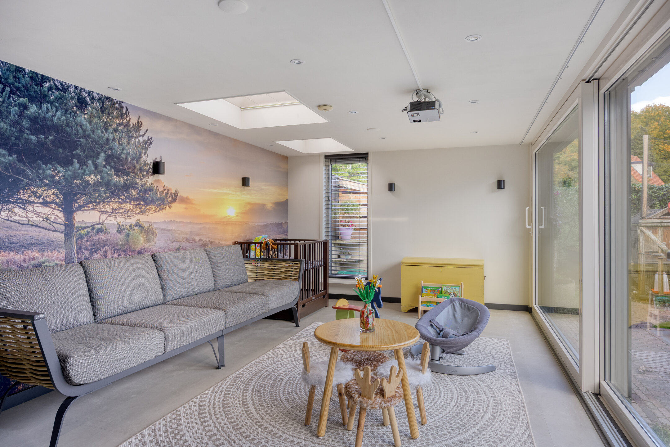 De extra ruimte achter de garage is ook een aanwinst. Met schuifpui, ramen en twee lichtkoepels is dit een plek die bruist van mogelijkheden. Werk je vanuit huis? Start je een salon of praktijk? Wil je een eigen chill- of gameroom voor de kinderen? Deze ruimte is klaar voor jouw ideeën. Bedenk ze vast!