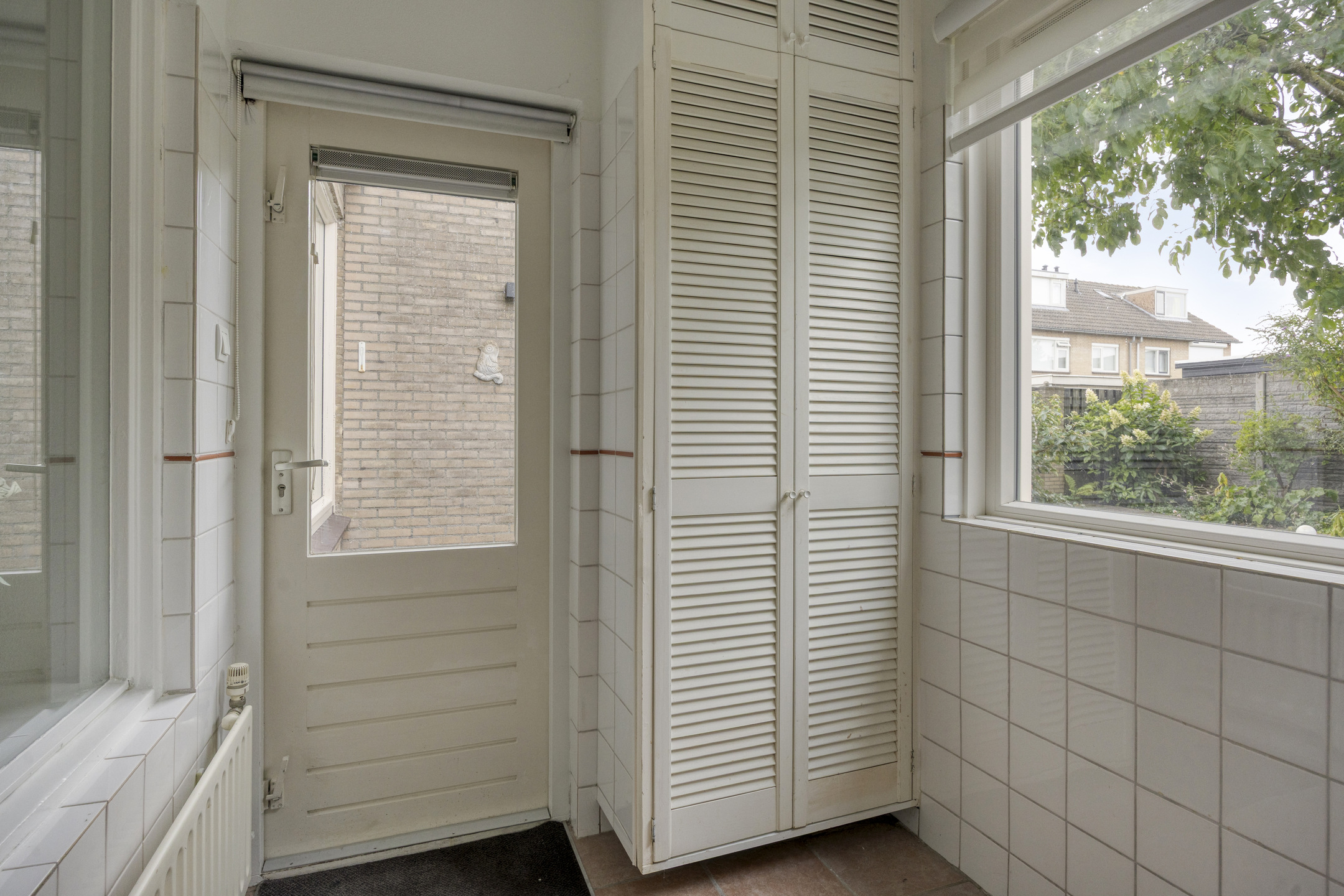 Achter de keuken is een bijkeuken aangebouwd. De perfecte plek om bij binnenkomst via de achterdeur de jassen op te hangen en de schoenen uit te doen. Daarnaast is er een wasmachineaansluiting aanwezig en geeft deze bijkeuken ook weer toegang tot de (brede) achtertuin.