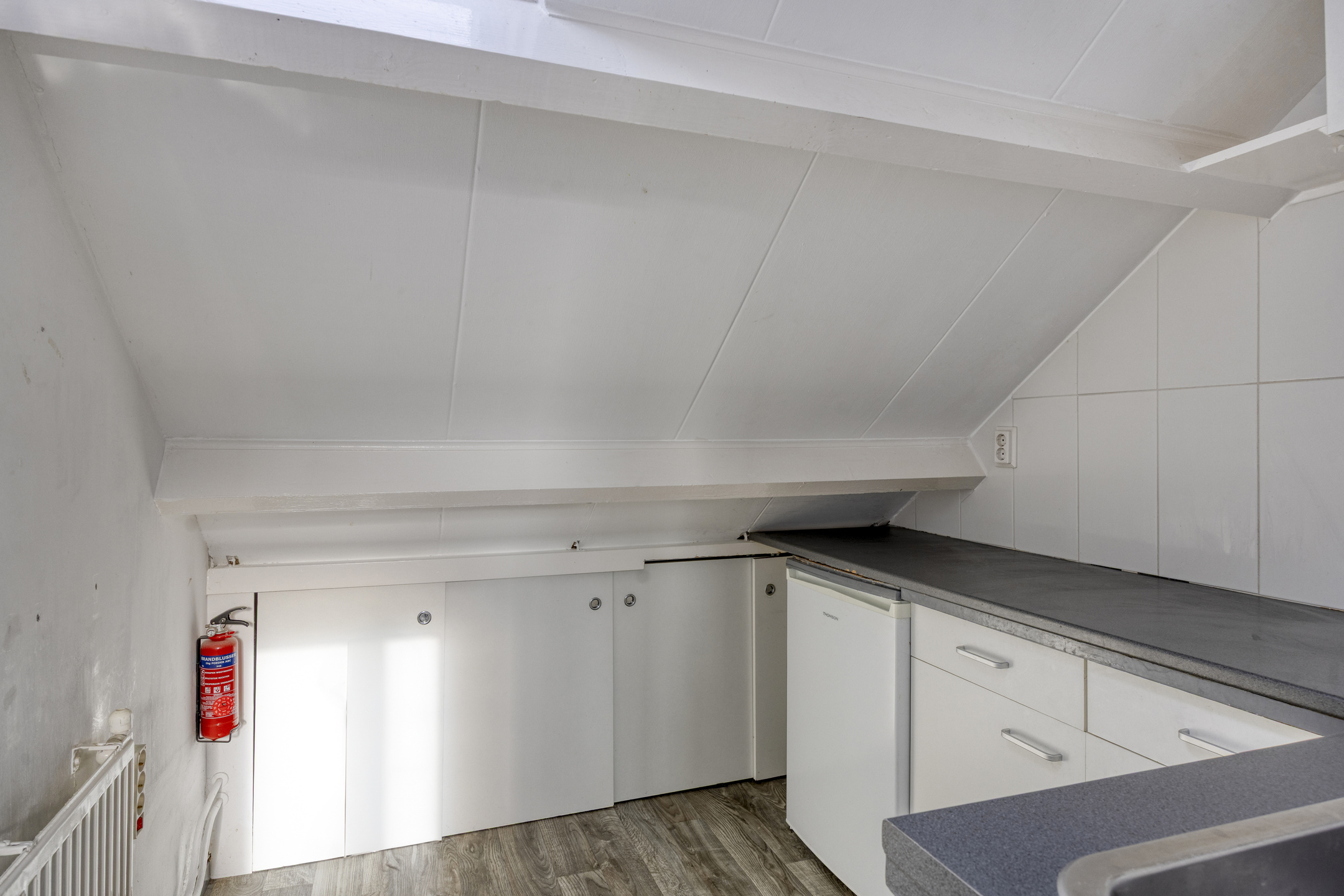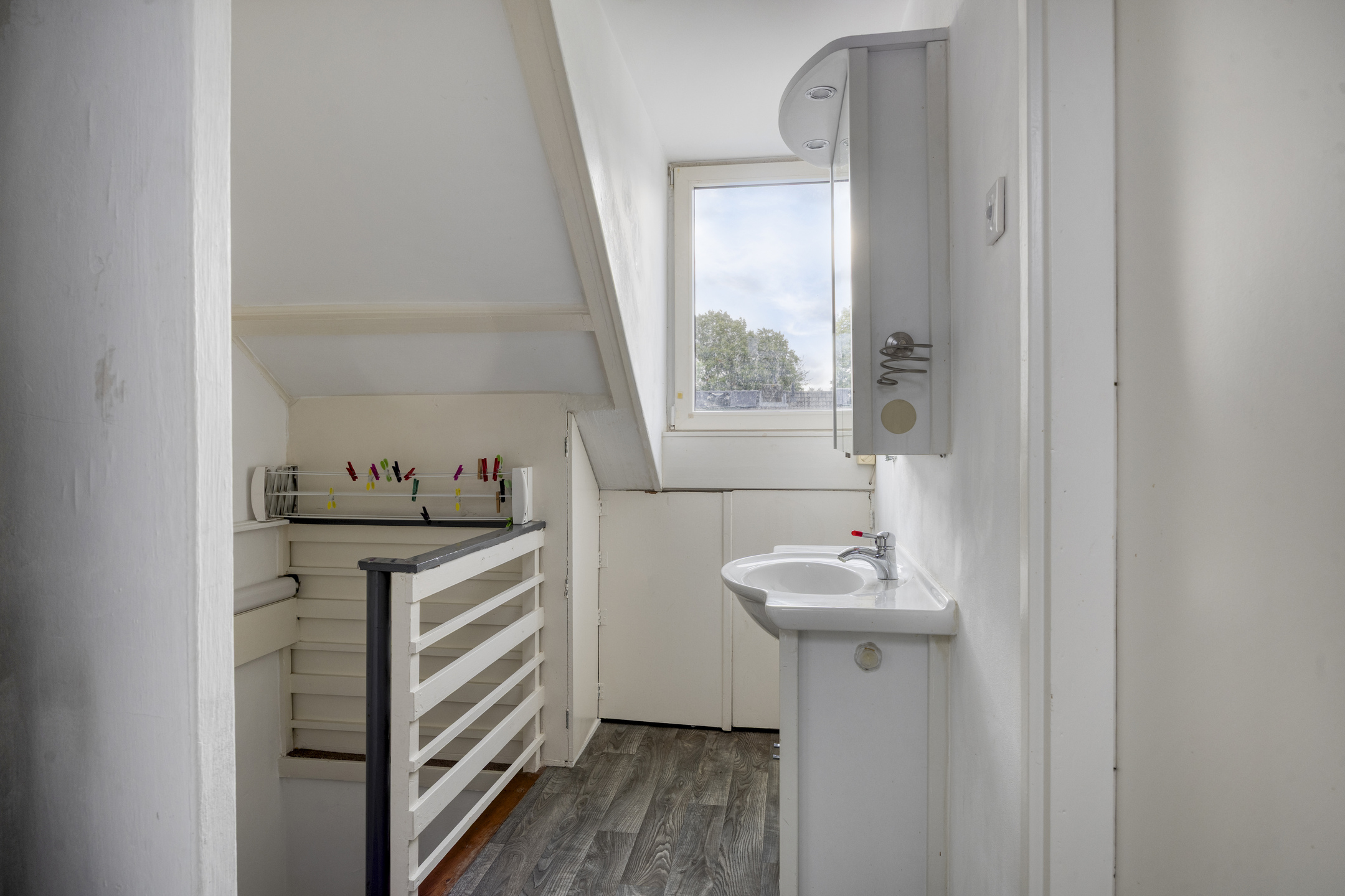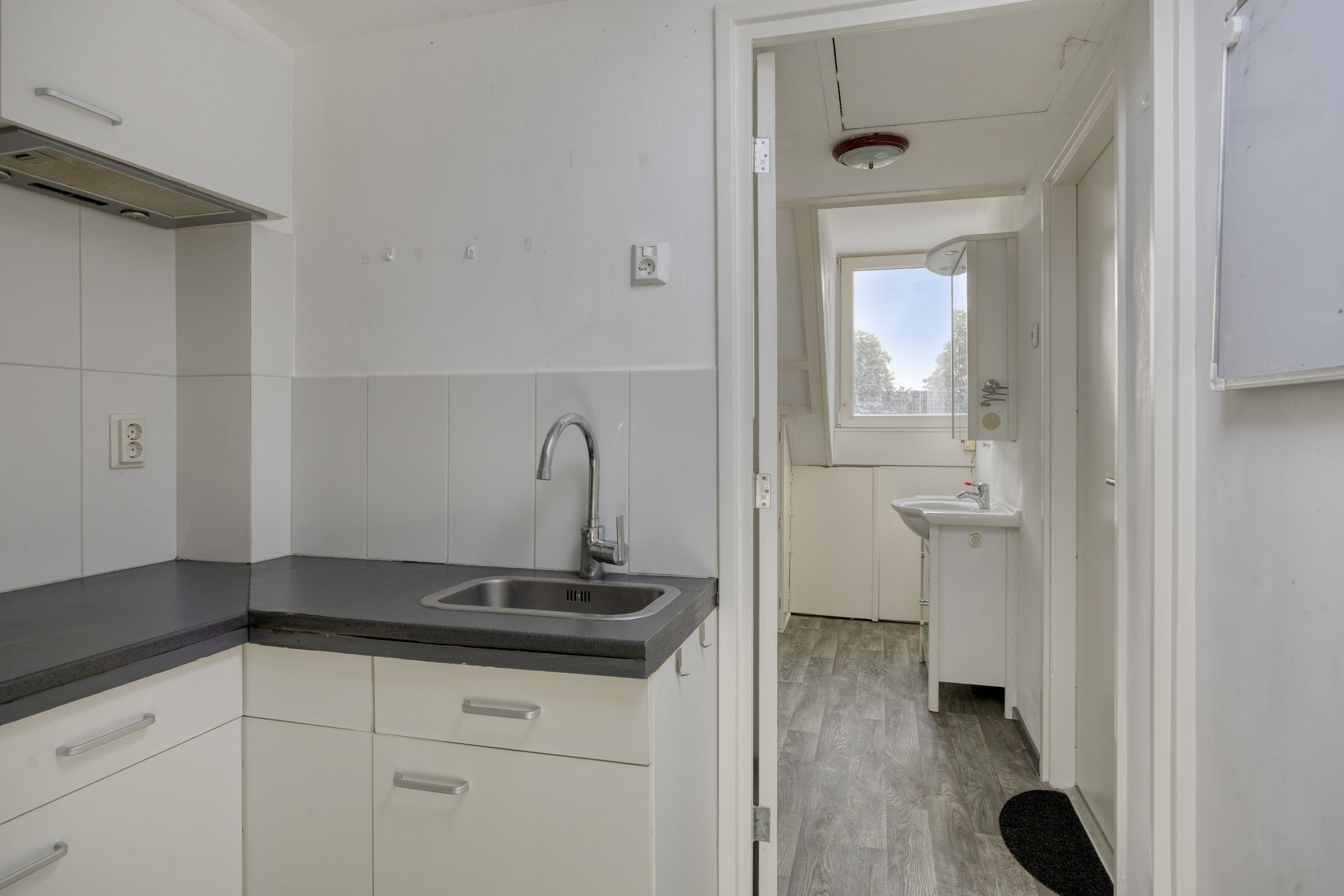 Op de voorzolder heeft men een wastafelmeubel geplaatst en ook is er een keukenblokje aanwezig.