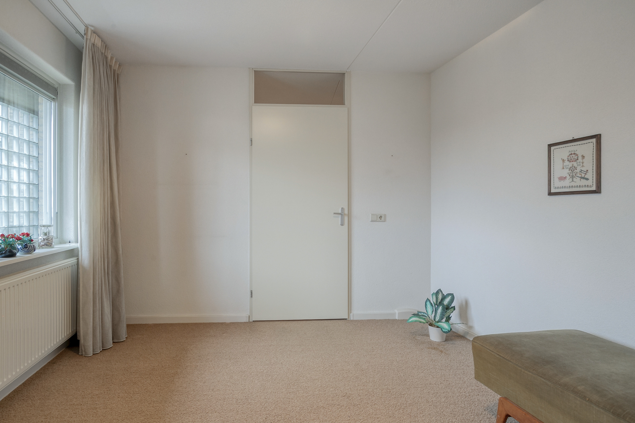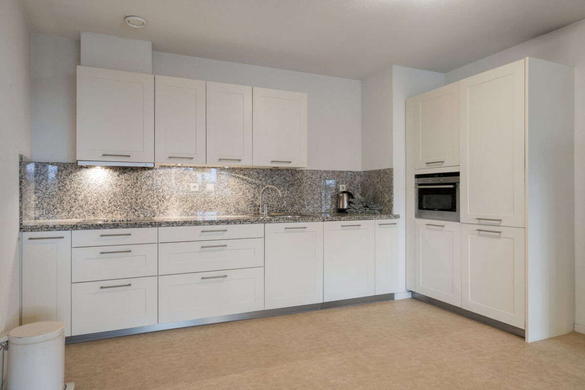 Aansluitend aan de woonkamer bevindt zich de neutraal afgewerkte keuken met natuurstenen aanrechtblad en inbouwapparatuur. Heel praktisch is de naastgelegen inpandige bergkast. Een prima ruimte voor bijvoorbeeld de huishoudelijke artikelen of de boodschappenvoorraad.